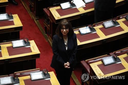 Newly elected Greek President Katerina Sakellaropoulou thanks the lawmakers during the swearing-in ceremony at the Greek Parliament in Athens, on Friday, March 13, 2020. Greece's first female president, a former high court judge, was being formally sworn in to office Friday, nearly two months after the country's parliament voted overwhelmingly to elect her. The swearing in ceremony for Katerina Sakellaropoulou was being held Friday in an almost empty parliament, as part of measures being taken to prevent the spread of the new coronavirus. (AP Photo/Thanassis Stavrakis, Pool)