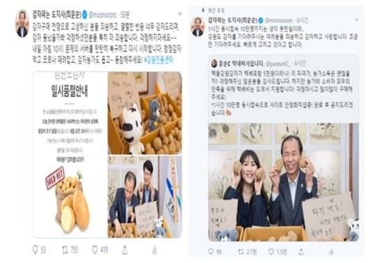 ![최문순 강원도지사가 지난 11일 강원도 감자 10㎏을 5000원에 판매한다고 홍보하고 있다. [사진 트위터]](https://img3.daumcdn.net/thumb/R658x0.q70/?fname=https://t1.daumcdn.net/news/202003/15/joongang/20200315100314275dawq.jpg)