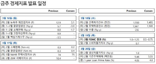 3월 미국 FOMC 결과는 오는 19일 발표된다. 시장의 컨센서스는 0.5%포인트(50bp)의 금리 인하를 예상하고 있다. 이 경우 금리는 0.5~0.75%까지 내려간다. 한국은행도 임시 금융통화위원회를 개최해 금리인하에 나설 가능성에 무게가 실린다.
