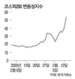 15일 한국거래소에 따르면 지난 13일 사상 처음으로 유가증권·코스닥 양 시장에서 동시에 서킷브레이커(CB)가 발동돼 코스피200 변동성지수(VKOSPI)는 전일(43.07)보다 25%나 급등한 53.86을 기록하며 글로벌 금융위기 이후 약 12년3개월 만에 가장 높아졌다. VKOSPI는 코스피200 옵션 가격에 반영된 향후 30일간의 변동성을 보여주는 지표로 주가가 추락할 때 대체로 급등하기 때문에 '공포지수'로도 불린다.