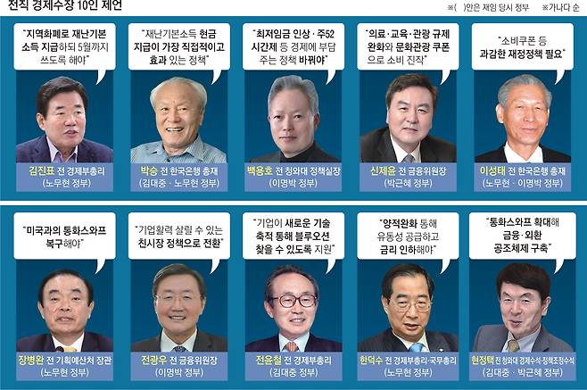 10명의 전직 경제 수장은 이날 서울신문과의 인터뷰에서 “2008년 글로벌 금융위기 이상의 경제 위기가 올 것”이라고 우려하면서 이런 내용의 해법을 제시했다. 인터뷰에는 경제부총리를 지낸 한덕수 전 국무총리와 전윤철·김진표 전 경제부총리, 장병완 전 기획예산처 장관, 박승·이성태 전 한은 총재, 백용호 전 청와대 정책실장, 전광우·신제윤 전 금융위원장, 현정택 전 청와대 경제수석 등이 참여했다.