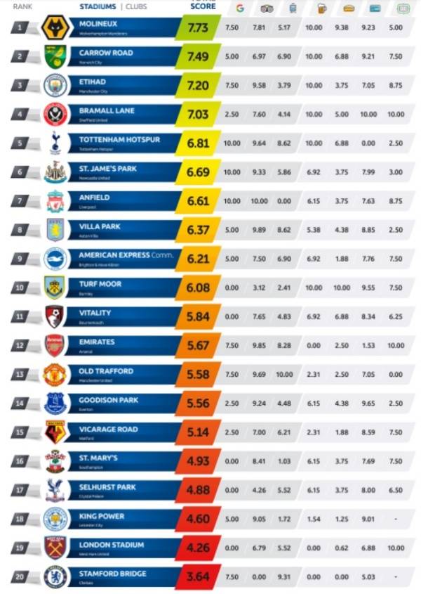 이 매체는 ‘OnlineCasinos.co.uk’의 자료를 토대로 표를 만들어 공개했다. 각 경기장을 구글 평점, 시즌 티켓 가격, 스타디움 투어 비용, 경기장 거리, 관광객 리뷰 등을 비롯한 총 7개의 카테고리 점수를 합산해 순위를 매겼다.