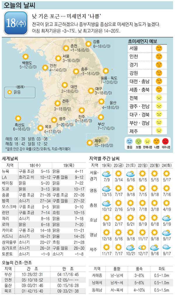 [오늘의 날씨] 18일, 낮 기온 포근..미세먼지 '나쁨'