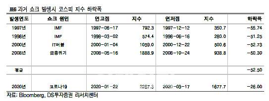 코스피지수는 올해 고점대비 26% 하락한 상황으로 과거 IMF나 금융위기 당시 고점대비 하락폭인 50%에 못 미치고 있다. 이번 코로나19사태가 본격적인 리세션으로 발전하게 된다면 코스피지수가 1200선까지 하락할 가능성도 존재한다는 분석이다.