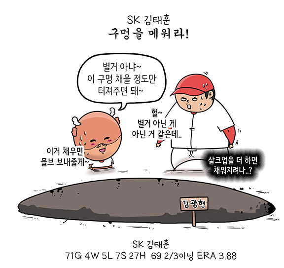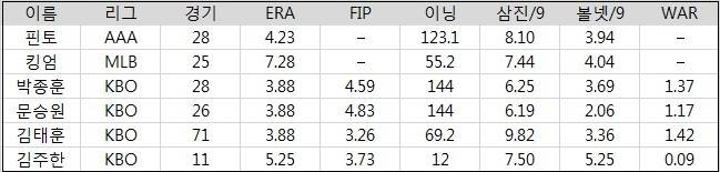 2년차를 맞이하는 좌완 김기훈은 구속 향상이 두드러지지 않는 가운데 제구마저 흔들렸다. 지난해 9이닝 당 평균 7.37의 볼넷을 남발해 자멸하는 경기가 잦았다. 피안타율이 0.224에 불과한 만큼 얻어맞더라도 정면 승부하는 투구 패턴이 절실하다.