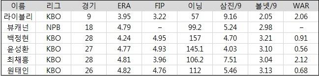 그나마 작은 위안은 맥과어이의 대체 선수로 8월에 영입된 라이블리가 4승 4패 평균자책점 3.95로 인상적인 면모를 보이며 재계약에 성공했다는 점이다. 그는 9경기 등판에 WAR 2.06을 기록해 2020년에 대한 희망을 키웠다. KBO리그 적응에 대한 우려는 지운 것이 라이블리의 최대 장점이다.