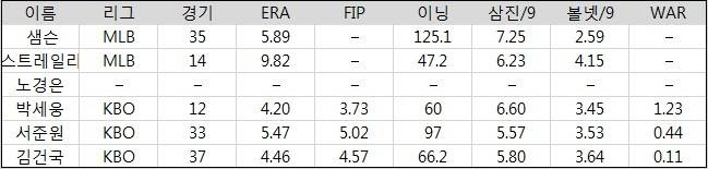 SK는 핀토와 킹엄을 영입해 외국인 투수를 물갈이했다. 두 선수 모두 탈삼진 능력을 갖췄지만 그에 못지않게 볼넷 허용도 적지 않았다. 지난해 핀토는 트리플A에서 9이닝 당 3.94개의 볼넷을, 킹엄이 메이저리그에서 9이닝 당 4.04개의 볼넷을 내줬다.