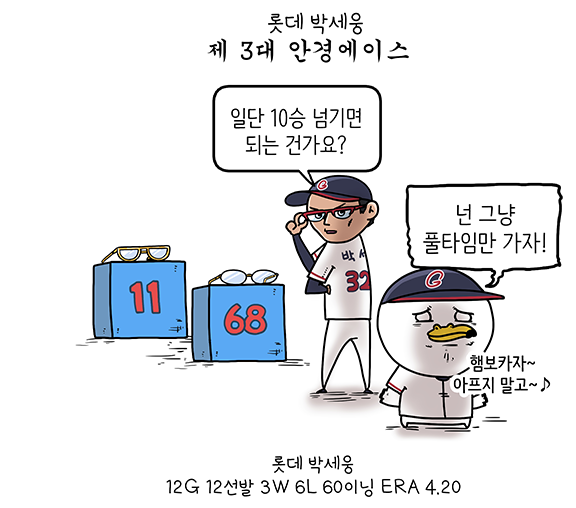 지난 몇 년 간 부상에 시달렸던 박세웅은 건강한 풀타임 선발 로테이션 소화가 절실하다. 지금까지 보여준 잠재력을 감안하면 언젠가 롯데의 1선발 에이스로 자리 잡아 ‘안경 에이스’ 신화를 물려받기에 충분하다.
