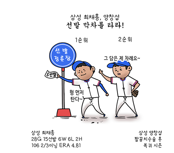 5선발을 놓고는 최채흥과 원태인이 경합한다. 최채흥은 좌완과 경험의 측면에서 우위를 점한다. 지난해 시즌 중반까지 강력한 신인왕 후보였던 원태인은 구위에서 강점을 지니고 있다. 두 선수 모두 풀타임 선발 경험은 없기에 상호 보완적 관계가 될 수도 있다. 부상에서 돌아온 양창섭에게도 시즌 초반 이후 선발 기회가 주어질 것으로 보인다.