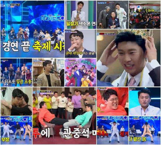 ‘미공개 영상’으로 합숙 당시 참가자들끼리 벌인 ‘허벅지 씨름’ 장면이 최초 공개돼 스튜디오를 포복절도하게 하는가 하면, ‘미스터트롯’에서만 볼 수 있었던 각종 퍼포먼스 무대 비하인드 스토리 역시 공개됐다. 춤이라곤 생전 춰본 적 없던 몸치 멤버들이 각고의 노력 끝에 ‘춤짱’으로 거듭나는, 기적 그 자체의 과정이 펼쳐졌다. 하지만 끝내 몸치를 탈출하지 못한 김호중과 이찬원은 ‘누가 더 못 추나’를 두고 막춤 데스 매치를 벌였고, 차마 눈 뜨고 보지 못할 춤사위로 폭소를 자아냈다. 이를 본 댄스 신동 김희재가 급이 다른 골반 튕기기로 두 사람의 기를 팍 죽인 가운데, 결국 현장 투표로 김호중이 ‘최고의 몸치’로 판정받고는 씁쓸하게 퇴장했다.