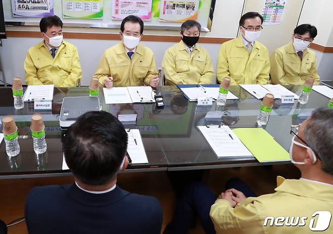 (서울=뉴스1) 이승배 기자 = 2020 개학연기에 따른 긴급돌봄 현장점검에 나선 정세균 국무총리가 20일 오전 서울 마포구 동교초등학교 교장실에서 엄용수 교장 등과 간담회를 하고 있다. 2020.3.20/뉴스1