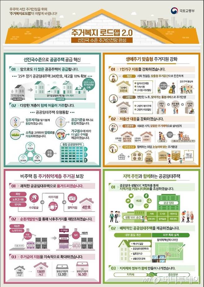 정부가 무주택 서민의 주거안정을 위해 장기 공공임대 주택을 2025년까지 240만가구로 늘린다. 공공임대 주택 공급 대상의 신혼부부 요건에 '만 6세 이하 자녀가 있는 가구'를 추가한다.