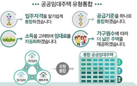 국토부 관계자는 다만 "현재의 유형통합은 건설형 장기공공임대주택인 영구·국민주택과 행복주택 이 세가지를 통합하는 것"이라고 설명했다.