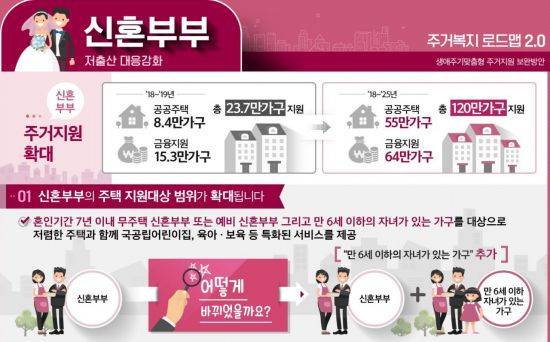 혼인 7년 이내 부부만 가능했던 신혼희망타운 등 신혼부부 대상으로 공급된 임대주택 입주 자격도 만 6세 이하 자녀가 있는 모든 가구로 확대된다. 혼인한 지 7년이 넘은 중년 부부도 늦둥이가 있다면 얼마든 입주가 가능한 셈이다. 다만 이 역시 정부의 다른 주거 복지 서비스나 민간분양에 대해서는 특례가 적용되지 않는다.