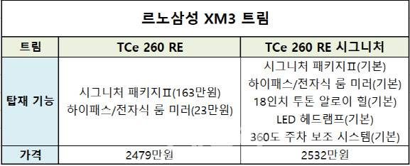 르노삼성의 크로스오버형 스포츠유틸리티차량(SUV) XM3가 출시 공식 출시한 지 약 2주 만에 계약건수 1만4000대를 돌파하며 흥행가도를 달리고 있다. XM3는 총 6개의 트림으로 출시됐으며, 각각 1.6 GTe 3개와 TCe 260 3개로 구성됐다.