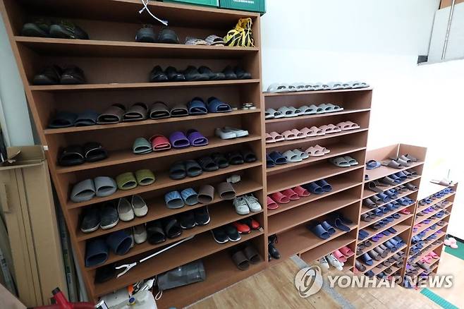 (대구=연합뉴스) 정회성 기자 = 신천지 위장교회로 확인된 대구시 달서구 한 상가 건물의 5층 사무실 신발장에 22일 실내화가 들어차 있다. 2020.3.22