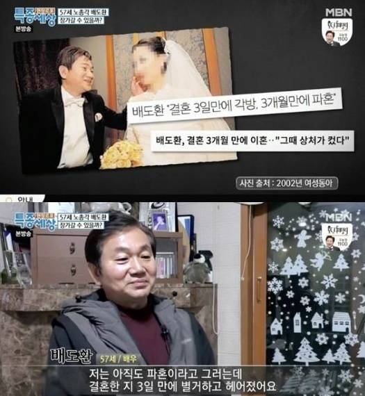 이날 배도환은 "난 아직 파혼이라고 한다. 결혼 3일 만에 각방, 40일 만에 별거하고 헤어졌다. 첫눈에 바보같이 콩깍지가 씌었다"며 성급한 결혼과 파경의 과정을 밝혔다.