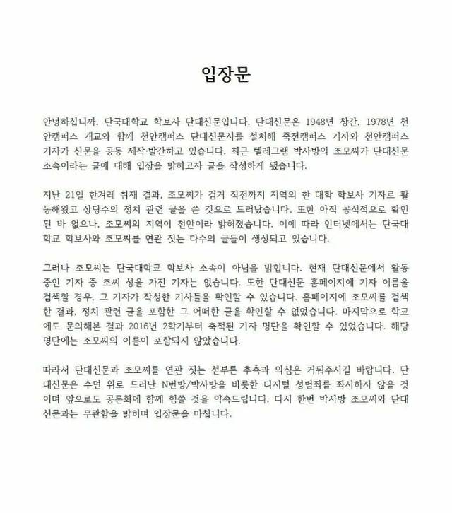그러면서 "단대신문과 조씨를 연관 짓는 섣부른 추측과 의심은 거둬주시길 바란다”며 “텔레그램 박사방 조씨와 단대신문과는 무관하다"고 강조했다.