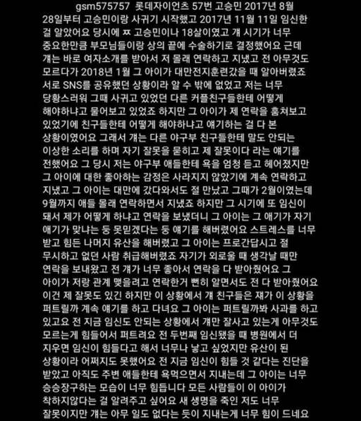 폭로 글에 따르면 첫 번째 임신을 했을 당시 A 씨는 18살이었고, 고승민에게 중요한 시기이다 보니 부모님들과 상의 끝에 유산을 결정했다.