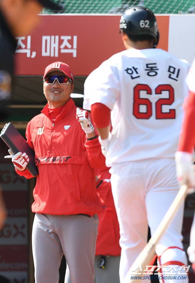 [포토] 이진영 코치, 한동민 솔로포에 함박 웃음!