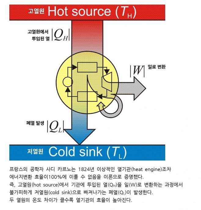 프랑스의 공학자 사디 카르노는 불과 28세인 1824년 이상적인 열기관을 만드는 연구를 한 결과 카르노 사이클 이론을 내놓았다. 이 과정은 다소 복잡한데(이공계 몇몇 학과에서 자세히 배운다) 결론을 말하면 열기관이 작동하는 온도 범위에 따라 효율이 정해진다는 것이다. 이를 수식으로 표현하면,