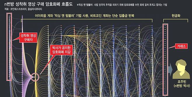 상세 분석을 보면, 이더리움 계좌는 2017년 5월8일 다른 암호화폐 지갑에서 9.49이더(104만원, 이하 당시 시세)가 입금되면서 첫 거래가 이뤄졌다. 이 계좌는 이후 소액이 계속 입금되면서 2018년 4월25일 무렵 2000이더(10억원)까지 자금 규모가 커졌다. 이후 이 돈은 연계된 또 다른 암호화폐 지갑으로 거의 대부분 이체됐다. 대신 다른 지갑들에서 돈이 일제히 넘어와 한때 8056이더(32억원)에 이르렀다. 이 지갑에선 박사방이 활발히 활동한 지난해 9월 이후에도 거래가 유지됐다. 이 돈은 사법당국의 추적을 피하고자 암호화폐를 수천차례에 걸쳐 쪼개고 합치는 수법인 ‘믹싱 앤 텀블러’ 방식으로 분산됐다. 이렇게 ‘세탁’된 암호화폐는 국외 거래소로 이체됐다. 조씨의 이더리움 계좌를 분석한 암호화폐 전문가는 “이런 방식은 자금세탁을 하거나 암호화폐에 대한 추적을 피해야 하는 사람들이 주로 활용하는 기법인데, 조씨가 그런 능력을 갖췄는지는 의심스럽다”고 말했다.