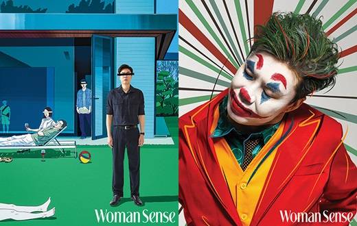 또 다른 화보에서는 '기생충' 포스터 속 송강호의 포즈를 취하고 있다. 까만색 테이프로 눈을 가린 채 심드렁한 표정을 짓고 있다. 포스터 속 송강호와 높은 싱크로율을 자랑한다.'조커'캐릭터로 변신한 모습도 눈길을 끈다.