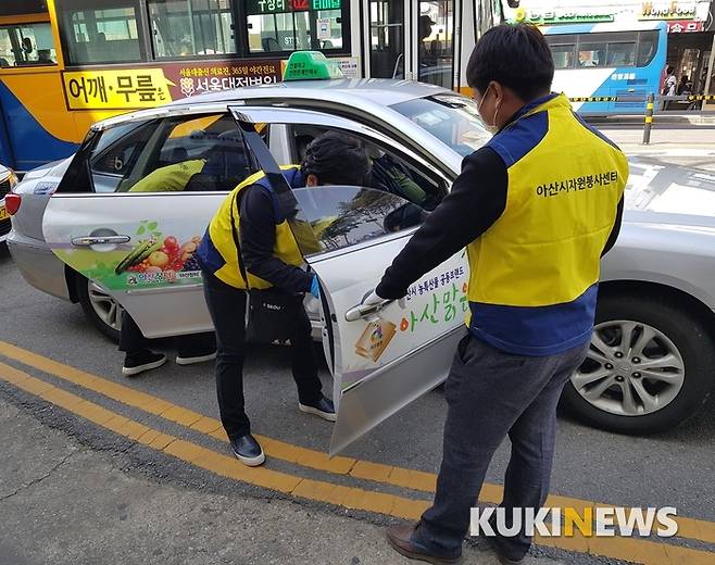 [아산=쿠키뉴스] 홍석원 기자 =아산시자원봉사센터(센터장 김대경)와 따사모봉사단(단장 유영금)은 지난 21일 유동인구가 많은 온양온천역 인근 택시 승강장에서 소독제를 사용해 택시 내·외부 손잡이를 일일이 닦아냈다. 오는 28일에는 따사모봉사단이 아산터미널 일대 버스승강장에서 버스 방역・소독도 펼칠 계획이다.