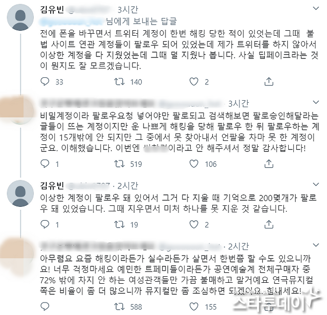 김유빈은 25일 "딥페이크 계정 팔로우 했다가 풀었다는데, 혹시 n번방도 들어갔나?"라는 한 누리꾼의 질문에 "전에 폰을 바꾸면서 트위터 계정이 한번 해킹당한 적이 있었다. 그때 불법 사이트 연관 계정들이 팔로우 되어 있었다. 내가 트위터를 하지 않아서 이상한 계정을 다 지웠었는데, 그때 덜 지웠나 보다. 사실 딥페이크라는 것이 뭔지도 잘 모른다"라고 해명했다.