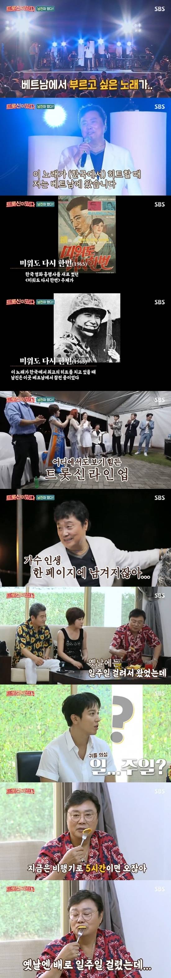 원래 남진은 장시간 비행기를 못타 베트남에도 불참하려 했다고. 하지만 남진은 “이 멤버가 온다는데 이런 기회가 두 번 있기 쉽지 않잖아. 우리 가요사에 어떻게 보면 처음이자 마지막일 수도 있고 어떨지 모르잖아. 내가 빠지면 안 되겠다 했다”며 “꼭 가고 싶더라. 한 페이지에 남겨지잖아”라고 말했다.