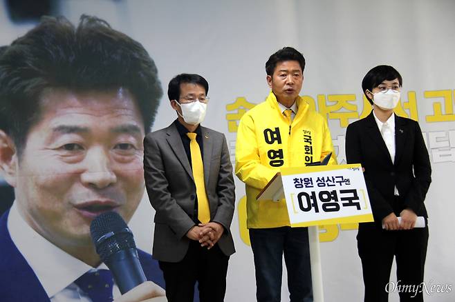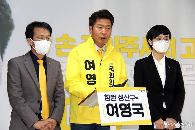 | ▲ 정의당 여영국 국회의원선거 후보(창원성산)는 26일 선거사무소에서 류호정, 양경규 비례대표 후보와 함께 기자회견을 열었다. |
