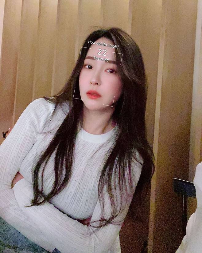 사진 속 유소영은 휴대폰 애플리케이션 속 효과로 나이를 측정하고 있다.