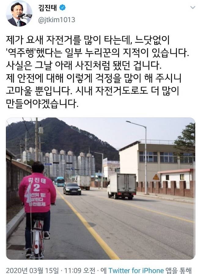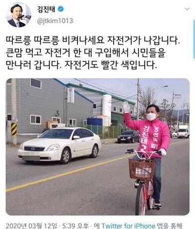 | ▲ 김진태 의원이 지난 12일 자신의 트위터에 올린 자전거 유세 사진. |