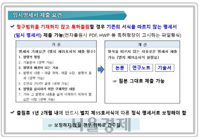 이에 특허청은 특허, 실용신안을 출원하면서 기존 서식이 아닌 자유로운 형식의 임시 명세서를 제출할 수 있게하는 특허법-실용신안법 시행 규칙을 개정했다.