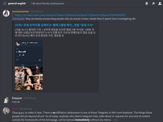 지난 27일 이곳 회원들은 자신들이 제작한 딥페이크 영상들이 한국에 퍼지고 있다는 언론 보도를 공유하면서 대책을 마련하기도 했다. 딥페이크 영상 제작 커뮤니티의 운영자로 추정되는 ‘D**’은 “우리는 ‘N번방’과 전혀 상관이 없다”며 “오늘부터 홈페이지 주소를 공유하는 회원은 즉시 차단될 것”이라고 공지했다. ‘momos*****’라는 아이디를 사용하는 회원은 “그들(한국 정부)은 우리를 조사하는데 시간을 쓰지는 않을 것이다”라고 자신했다. 이들은 이후에도 새로운 딥페이크 영상을 계속 만들어 배포했다. 공정식 경기대 범죄심리학과 교수는 “딥페이크 음란물은 암흑시장이 이미 상당히 형성된 것으로 보여진다”며 “앞으로 사법당국이 과감하게 수사하고 처벌해야 한다”고 지적했다.