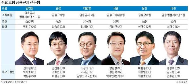 광장은 전통적인 금융회사 규제뿐만 아니라 새로운 핀테크(금융기술) 분야에서 생길 수 있는 법적 쟁점들까지 검토하고 있다. 율촌은 금감원팀, 금융위팀, 금융송무팀 등을 세분화해 운영하며 형사 변호사들과 협업하는 데 초점을 맞추고 있다. 세종은 금융회사 내부 통제를 연구하는 태스크포스(TF)를 꾸렸다. 바른은 금융회사뿐만 아니라 금융소비자를 대리하는 소송에도 관심을 기울이고 있다.
