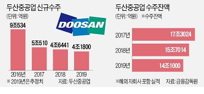 두산중공업은 30일 지난해 신규 수주액이 4조1800억원가량으로 추산된다고 밝혔다. 3년 전인 2016년(9조534억원)과 비교해 53.8% 급감했다. 작년 매출(별도 기준)은 3조7086억원으로 최대 실적을 올린 2012년(7조6726억원)의 절반에도 못 미쳤다.