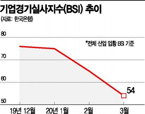 기업들이 느끼는 체감 경기도 급락했다. 이날 한국은행이 발표한 '3월 기업경기실사지수(BSI)'도 54로 전월 대비 11포인트 하락했다. 기업들의 3월 체감 경기는 금융 위기 당시 수준으로 추락했는데 기업 규모와 업종을 가리지 않고 전반적으로 모두 악화한 모습을 보인 것이 특징이다. 제조업 BSI의 경우 56을 기록해 전월(65)보다 9포인트 떨어졌다. 제조업 BSI는 2009년 3월(56) 이후 최저 수준이다.