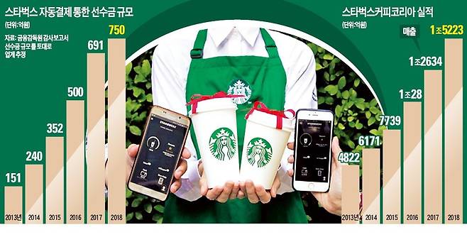 스타벅스는 소비자 편의를 위해 잔액이 설정한 금액보다 낮아지면 등록한 신용카드에서 자동으로 충전해주는 기능을 넣었다. 선불충전금이라고 부른다. 이 선불충전금은 2013년 151억원에서 지난해 약 800억원대로 늘었다. 토스, 카카오페이 등 국내 간편송금업체가 보유한 잔액을 모두 합친 것과 맞먹는 규모다. ‘스타벅스 이코노미’ ‘스타벅스는 금융회사’라는 말이 나올 정도다. 스타벅스 이코노미는 계속 성장하고 있다.