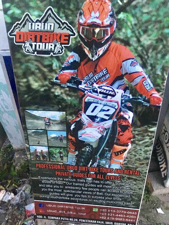 발리는 울룬 다누 베라탄 사원, 타나롯 사원, 자티루위 라이스 테라스(rice terrace) 같은 문화유적지나 자연명소가 곳곳에 있지만 다양한 즐길 거리도 많습니다. 래프팅(아융강보다 뜨라가와자 강이 수질도 좋고 더 재밌다더군요)이라든가 제가 싫어하는(TMI) 해양 스포츠류라든가···. 그런데 길 가다 우연히 발견한 이 광고는 참 끌리더군요. 도로를 조금이라도 달려야된다면 한국인 참여 자체가 불가능하겠지만, 또 검색해보니 바닷가, 산길, 논두렁(...?) 등 오프로드 코스 입구에서부터 바로 시작하는 투어입니다. 그래서 홈페이지에도 ‘면허 필요 없음’이라고 표시돼 있습니다. 장비 일체 제공에 전문 가이드가 동행하니까 무경험자도 안전하게 즐길 수 있다는 설명과 함께요. 저는 이미 일정이 다 끝나가서 못 해봤지만, 발리에 놀러가는 두유바이크 독자분이라면 한번 고민해보셔도 좋을 것 같습니다.