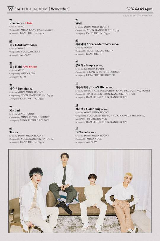 '컴백' 위너, 정규 3집 트랙리스트 공개..타이틀곡 'Remember' 송민호 작사·작곡