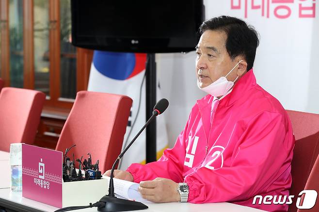 (서울=뉴스1) 민경석 기자 = 심재철 미래통합당 원내대표가 1일 오후 서울 여의도 국회에서 열린 기자간담회에서 발언을 하고 있다.