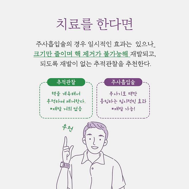 결절종의 치료방법으로는 추적관찰을 통한 수술과 주사흡입술 등이 있다.