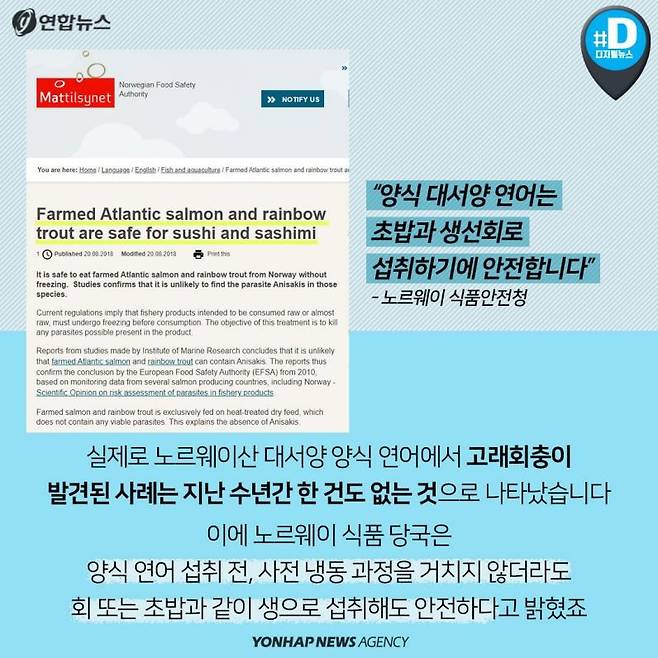 이에 노르웨이 식품 당국은 양식 연어 섭취 전, 사전 냉동 과정을 거치지 않더라도 회 또는 초밥과 같이 생으로 섭취해도 안전하다고 밝혔죠.