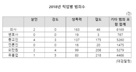 다른 범죄라 해도 상황은 크게 달라지지 않는다. 대검찰청에 따르면 2018년 범죄를 저질러 검거된 의사 수는 6169명에 이른다. 단일 전문직 중 가장 많은 수치다. 전문직은 물론 경비원, 외판원, 유흥업종사자보다도 많다. 살인, 강도, 방화, 성폭력 등 강력범죄도 165건이나 된다. 그러나 현행법이 이들의 의사자격을 취소하지 않아 출소 뒤 병원에서 근무가 가능하다.