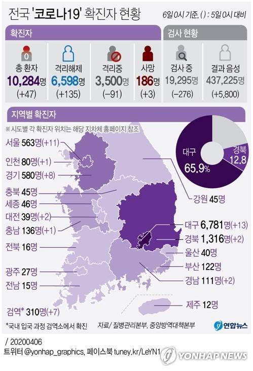 (서울=연합뉴스) 이재윤 기자 = 6일 국내 신종 코로나바이러스 감염증(코로나19) 확진자는 총 1만284명으로 집계됐다. 해외 유입과 수도권 집단감염 사례가 계속 확인되고 있다.