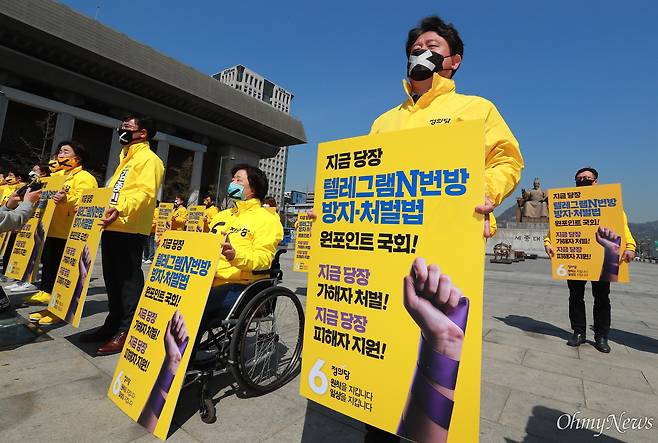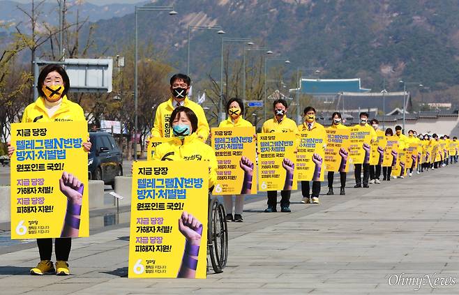 21대 총선에 출마한 정의당 심상정 대표와 후보 및 당원들이 6일 오전 서울 광화문광장 주변에서 '텔레그램 n번방 방지-처벌법' 제정 등을 위한 원포인트 국회 개원을 촉구하는 1시간 침묵 선거운동을 벌였다.