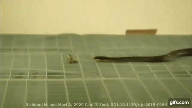 줄무늬뱀도 일단 개구리를 잡기 위해 깨물려는 동작을 하면 그 진로를 중간에 바꿀 수 없었다. 또한 이들 뱀은 꿈틀거리는 동작에 따라 몸이 늘어나면 그것을 다시 구부리고 나서야 이동할 수 있다는 사실도 확인됐다. 이 때문에 줄무늬뱀이 먼저 물려고 하면 그 무는 동작을 피하기 쉽고 그 후 약 0.4초 동안 경직되는 시간이 발생해 추가로 공격하지 못하는 것으로 나타났다.