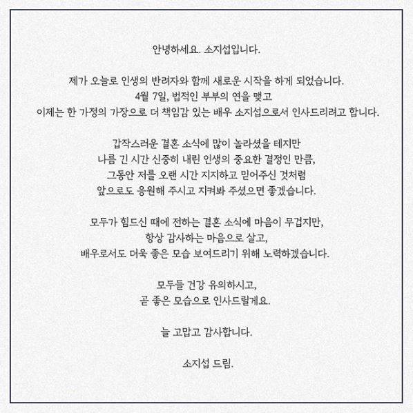 제가 오늘로 인생의 반려자와 함께 새로운 시작을 하게 되었습니다. 4월 7일, 법적인 부부의 연을 맺고 이제는 한 가정의 가장으로 더 책임감 있는 배우 소지섭으로서 인사드리려고 합니다.