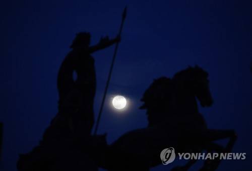 epa08349183 The Super Pink Moon rises over the statue of Boadicea and Her Daughters in London, Britain 07 April March 2020. The Fullmoon is in fact closer than usual and appears a little larger and around 15 percent brighter. It is the third supermoon in 2020. EPA/FACUNDO ARRIZABALAGA